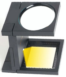 Instrumento óptico con lente de aumento utilizado para la observación detallada de impresos. Permite observar puntos de tramas, registros, desfasajes, ganancias de puntos y detalles de impresión.